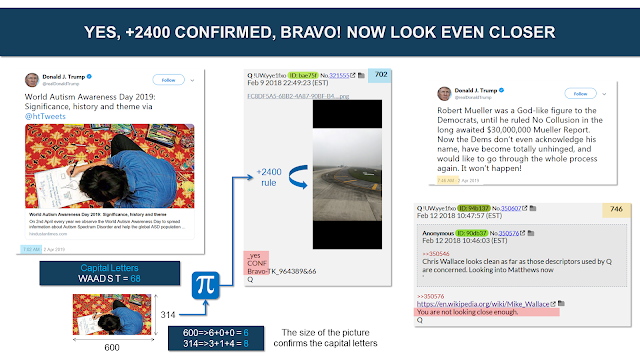 Img4 Il delta tra i 2 tweet dell'Autism Day è di 7:40 e le lettere maiuscole del secondo tweet aggiungono fino a 74 lettere. Coincidenza? Applichiamo la regola del 1200 al timestamp 2:42 PM=14:42, tira il Q242 dove leggiamo: "sii qui domani, la storia si dispiega".