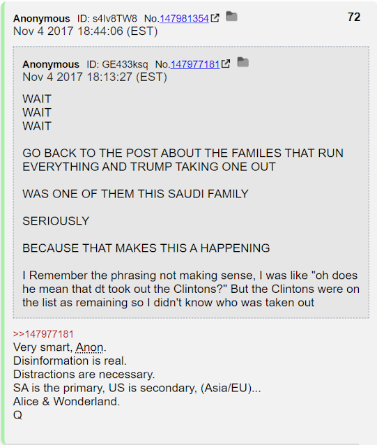 Durante la prima settimana di novembre 2017, nessuna di queste persone è stata arrestata o incriminata. Ma i membri della famiglia reale saudita sono stati arrestati il 4 novembre. Q aveva anche lasciato cadere accenni all'Arabia Saudita (SA) in questo periodo, anche se non ha menzionato specificamente gli arresti.